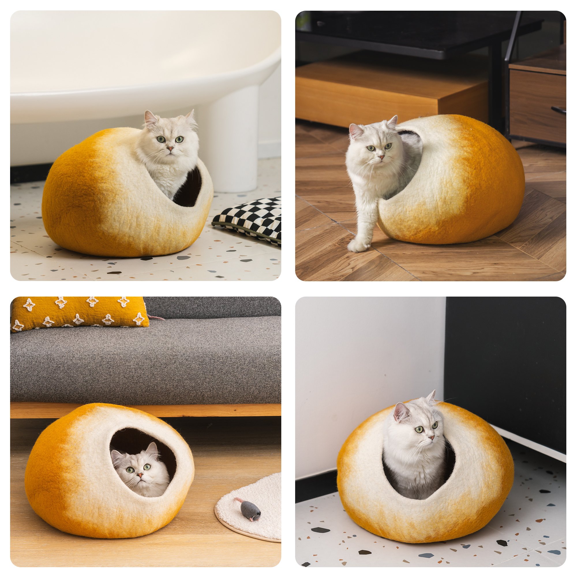 [Handcrafted Cat Cave]Each cat cave bed is handcrafted by crafters in Nepal.it is made of wool; its good for cold weather as this will keep them warm.the cave cat bed gives your pet a touch of privacy and creates a good sense of security; the ideal cat hideaway. the cave comes with a mouse toy as a gift.